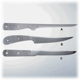 | Notes: Inasmuch as these fillet knives do not require a guard or bolster, they are extremely easy to build and finish. I have no clue as to why the two holes in the handles for pins are different sizes and have received no other explanation beyond "tradition". Water resistant Kydex makes the best sheath material. | ||||