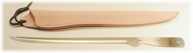 Swordfish Fillet Knife Just in time for fishing season! Regardless if you're actually going to be going after deep sea swordfish, or just want to convince your friends that you want to be ready for that 40 pound trout, this generous sized fillet knife will always serve you well. Quality 440C, this thin and flexible blade will hold a razor edge for a good long time . Overall 16" with a 10 1/2" cutting edge. Holes are metric, but 1/8" pins would work fine. Optional Matching Swordfish Fillet Sheath is made of 9 ounce top grain leather, suitable for engraving but will need to have leather finish applied. Click HERE for instructions |