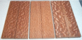 Hardwood Slabs I anticipate that this first section of exotic wood for handles will change as often as my inventory does. Since this is a natural product, every shipment I get in is different than the last. I'll always try to give you a picture from the current batch so you get a good representation of what I'm selling. Even so, there will always be some variations. The scales you receive will be lighter in color and won't look like the pictures until some sort of clear finish is applied. As a matter of fact, many times the burl wood patterns will appear hard to see until the color is darkened with a clear finish. If you're in a hurry to see what it's doing to look like, wet the scales with a spray of denatured alcohol ( a water spray would promote warping). I cut a lot of my own scales and will always try to "book match", i.e make sure that the cut pieces are adjoining cuts so the grain is consistent and both halves match. Scales are a little different every time I cut them but will be a minimum 3/8" thick x 1 1/2" x 5 " unless otherwise noted |