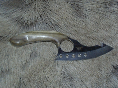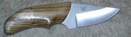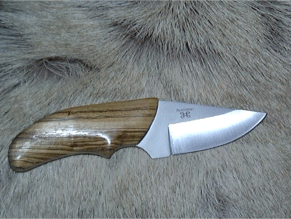 | This is the Ferret blade with zebra wood handles, again by Gino Acevedo. Gino is an inspector at an aircraft repair facility and has access to an etch machine to add his logo to the blade. He also uses their sand blasters to give his blades a satin finish. | ||