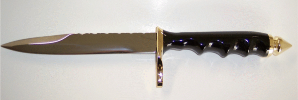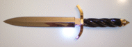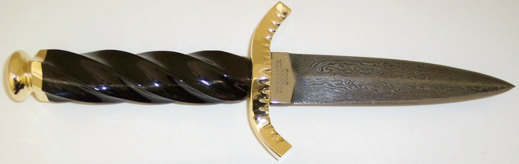 | Another beautiful creation by Keith Thrasher, this one a Saber ground Damascus Dagger with buffalo horn handle. You got to love that intricate fluting. Obviously a work of love. You can write to Keith at: thrasher1328@mchsi.com | ||