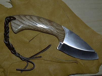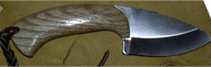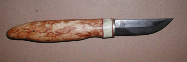 | Made from the Puukko Kit ( See Blades, Page 4) for a very lucky friend by the Rev. Rich Celley. He used the curly birch block provided and finished it with a Danish oil that had a cherry stain mixed in to accentuate the grain. You can drop the Rev. Rich a line at richard@rcelley.com | ||
