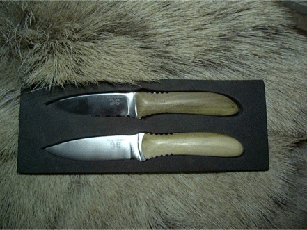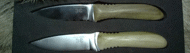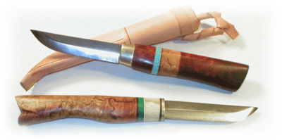 | A couple of Finish Puukko's illustrating the two types of traditional construction, guard and ferule. These were made with the new progression tempered blades where the edge is tempered harder than the spine to hold an edge for a long time while still remaining strong and flexible. To see how these were made, please see the Progression Tempered Puukko tutorial, click HERE. | ||