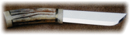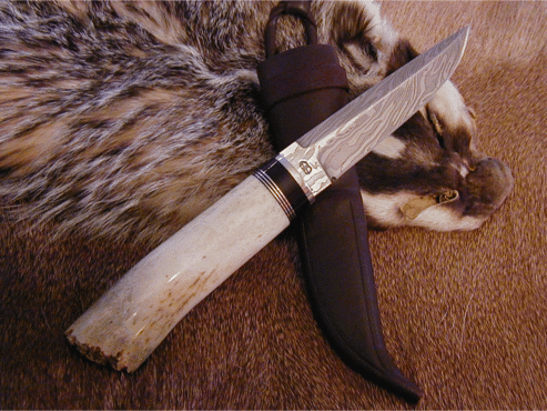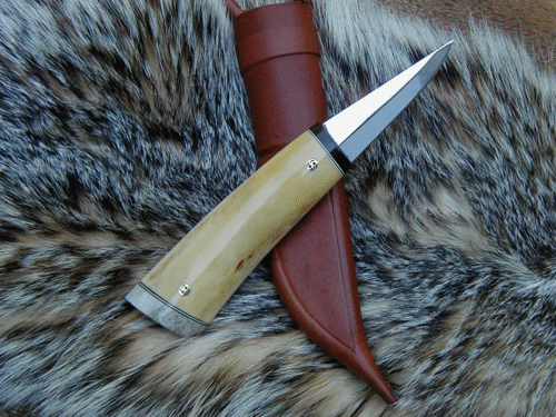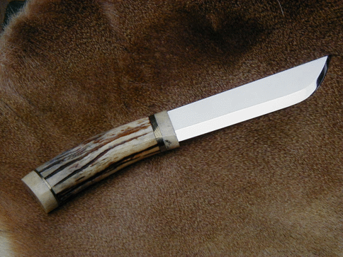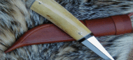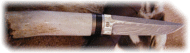 | Another beauty by Lynn Patrick, this one made with a Sandvik steel drop point blade by Lairi with reindeer shed handle and Finnish moose and musk ox spacers. I think this knife's greatest beauty is in it's simplicity and elegance. Lynn is at patrickknives@chartermi.net | ||