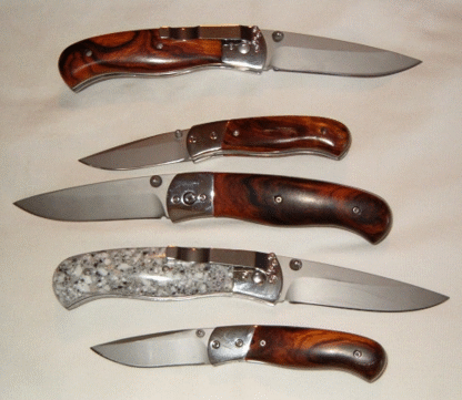 | A gaggle of beautiful Darrel Ralph DDR's, again by knifemaker Ron Ker. I recognize the corian knife scales and I'm going to guess walnut on the rest. Ron is at ronrek@worldnet.att.net | ||