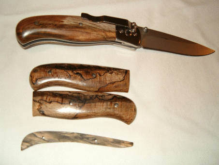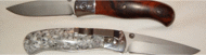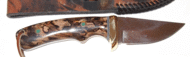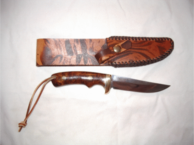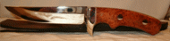 | Ron Ker again, this time with a Piranna blade and spalted beech handles. That camouflage look is the natural grain in the wood ! I'd suggest buying one of Ron's blades now before he gets famous and the price doubles! Ron is at ronrek@msn.com | ||