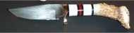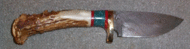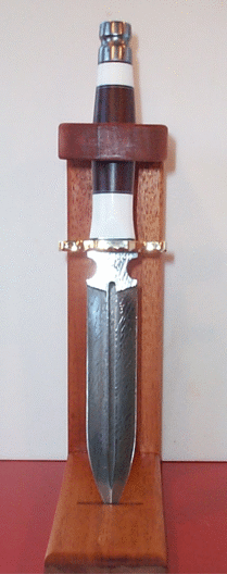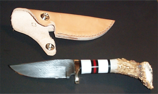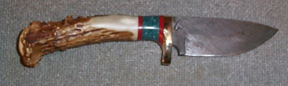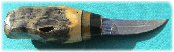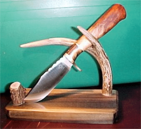 | Photo from knifemaker Bud Smith of a gorgeous hollow ground hunter with laminated spacer and a birdseye maple handle. Is this a knife you'd be proud to sport or what? Click for a larger picture to see the unique horn display stand. Bud is at nifeman@adelphia.net | ||