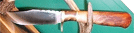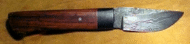 | Another beauty from knifemaker Bud Smith. Cocobolo handle with blackwood spacer. Blade is random damascus with a nice hollow grind. | ||