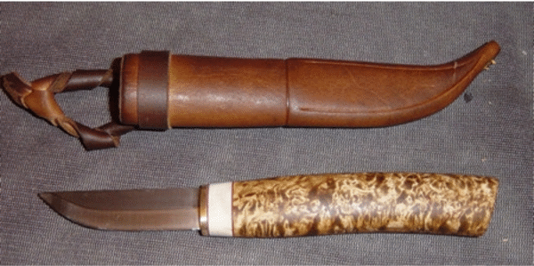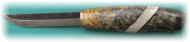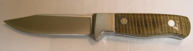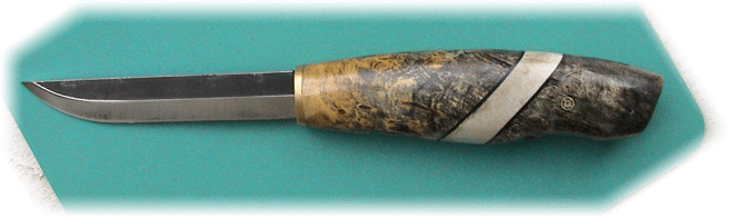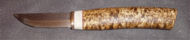 First time knifemaker Juan Durango sent in this picture of his Puukko. The light stain really accentuated the differing grain in the curly birch handle. Gorgeous, just gorgeous. Juan can be reached at juandurango3@yahoo.com | |