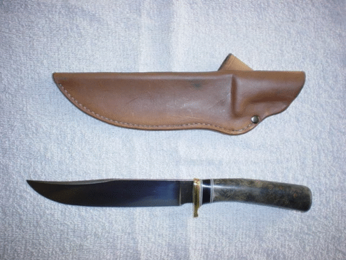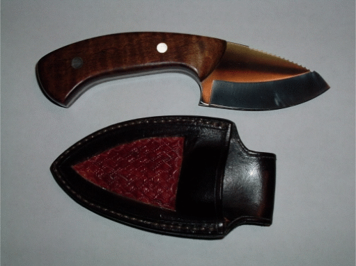 This is Robert Bair's third knife and I think it looks great. This is the Northland Skinner. I love the stained tiger striped maple handles and get a load of that gorgeous handmade sheath! Robert is at: bair@mlode.com | |