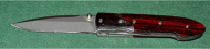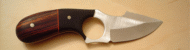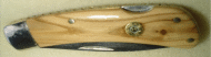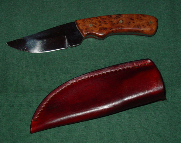 Paul Becigneul did a great job on this Piranha blade by using a gorgeous and rare Thuya Burl for scales and brass pins. Beautiful sheath, also. Paul is at: pbike@comcast.net | |