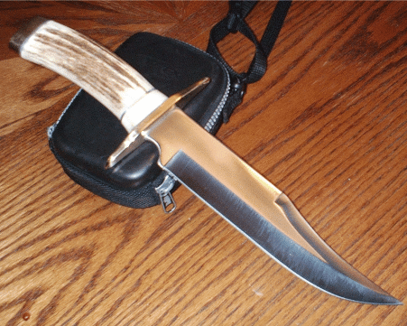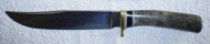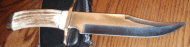 Now this is what the Texas Bowie is supposed to look like! Canadian lnifemaker used Elk Horn for the handle and oversized brass pommel. You could probably chop firewood with this thing! Nice job. Fred is at: mrfixit@shaw.ca | |