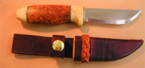 Fourth time out for knifemaker Tom Gallant, and he made this beautiful puuko style blade with moose antler spacers and curly birch handle. And get a load of that custom sheath ( larger picture). The braid would take me days to figure out. Tom is at tgallant@acsalaska.net | |