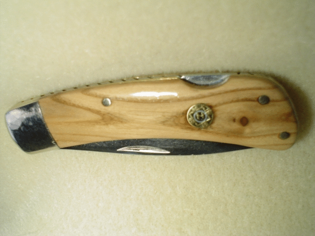 And this is what Chris Huang's decorative mosaic pins look look like on an All American folder. Scales are olivewood. Beautiful. | |
