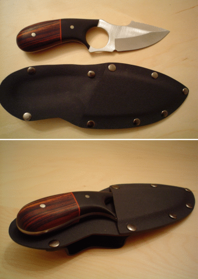 Another beauty from Kata Nam, this time a Bear Claw adorned with cocobolo and black micarta handle, with red fiber spacer for contrast. Also illustrated is Kata's first try at a kydex sheath. Pretty cool. Kata is at: kataliewici@yahoo.com |