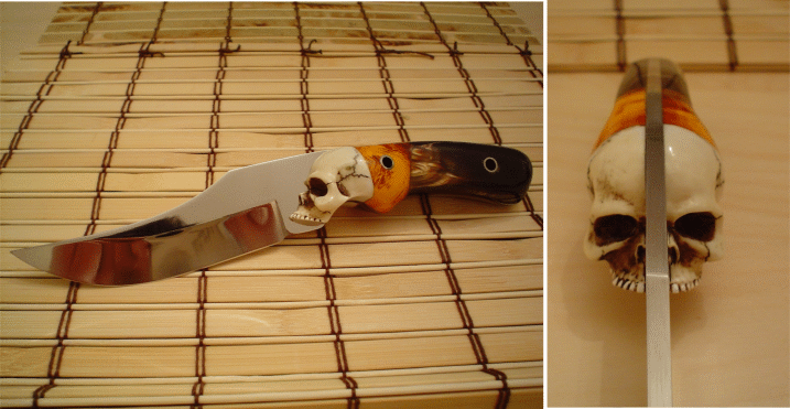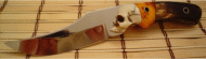 Here's an example of imagination and creativity: this started out in life as a Lion Skinner blade but knifemaker Kata Nam used the skull from a keychain instead of a guard. The poly amber and buffalo horn handles yields a one of the few fantasy designs that I've ever seen that is a hard working, functional blade also. Kata is at: kataliewici@yahoo.com | |