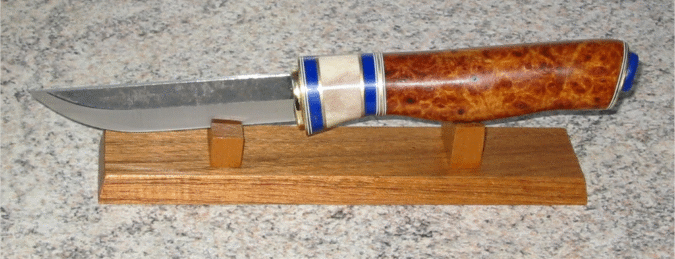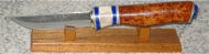 Another clean and simple puuko design from Ruud Overmeer from the Netherlands. This one sports an amboyna handles with reinder horn, lapis and black and white fiber spacers. Looks nice on the stand but I bet it feels better in the hand. Ruud is at : ruudo@planet.nl | |