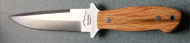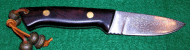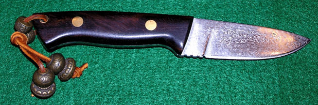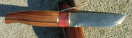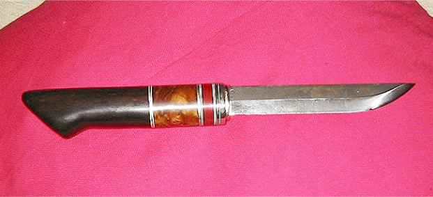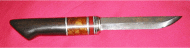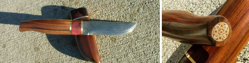 Another beauty from Gary Silvers, this time a Puukko design from damascus steel with purpleheart and rosewood handle , brass spacers and a wood sheath from rosewood. Click on the larger picture to see his marvelous decorative mosaic pins in the base of the handle. Gary is at: gwsilvers@netzero.com | |