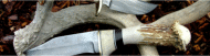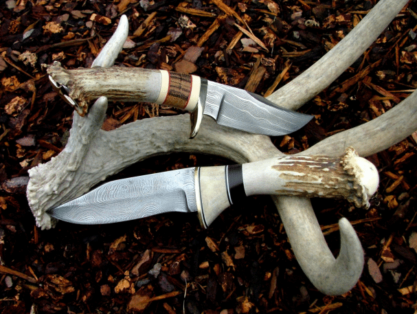 To give us all something to aspire to, old friend Gary Silvers sends this picture of his two new damascus beauties with deer horn handles and cocobolo or elk horn spacers. Blades are from Deer Mountain Forge. Gary is at: gwsilvers@netzero.com | |