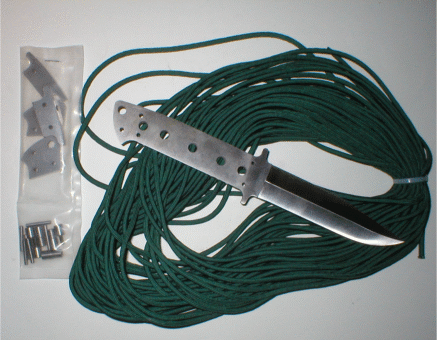 | For this tutorial, I picked Darrel Ralph's new and absolutely gorgeous Delta 5 Chute Knife. The matching hardware that comes with this excellent kit was beautiful, too, and I hated to put it aside. The cord used is called paracord and yes, it's the same stuff they use on parachutes. I found a nice forest green paracord at an Army surplus store. Available in several colors and it's cheap. Very durable stuff. | ||