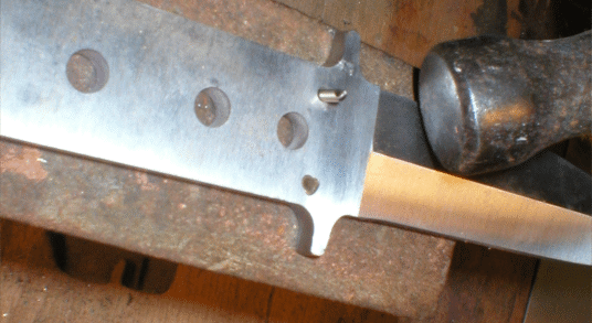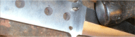 The Delta 5 had a few extra holes meant for mounting the hardware, but they would be extraneous for this type of handle. I'm going to leave the large center pin ( these holes won't be seen under the cord wrap) and thong holes , but am going to fill the 3/32" holes with some short lengths of peened nickel silver pins. | |