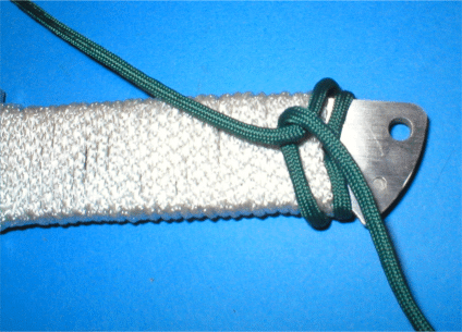 Start the second layer of wrap by looping the paracord through the back hole. This will anchor it securely. | |