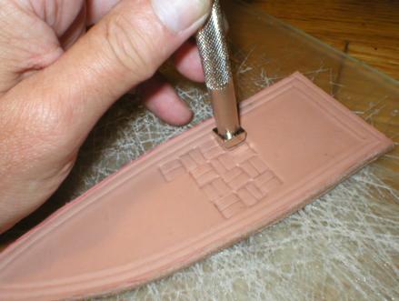 Start stamping in a straight line, rotating the stamp 90 degrees between impressions. Get as close to the inner outline as possible without going over. This performed while the leather is still damp . | |