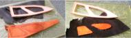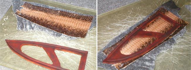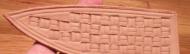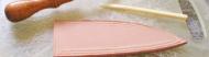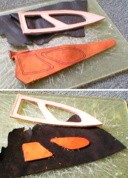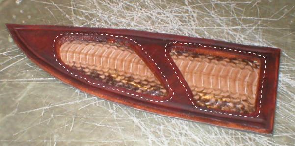 Inlay backing glued to the thin leather backing. Make sure these match up to the cutouts in the sheath front. | |