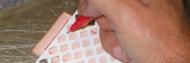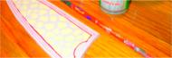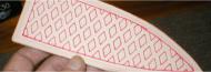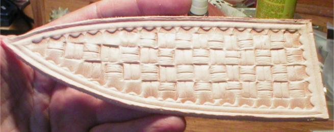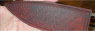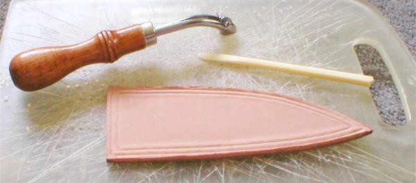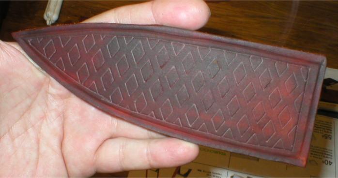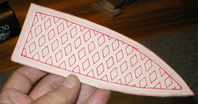 Using the red roller ball pen, I trace the inside of the diamond pattern on the front of the leather sheath. Do this on the leather after it has dries and press hard and make several tracings to emboss the leather | |
