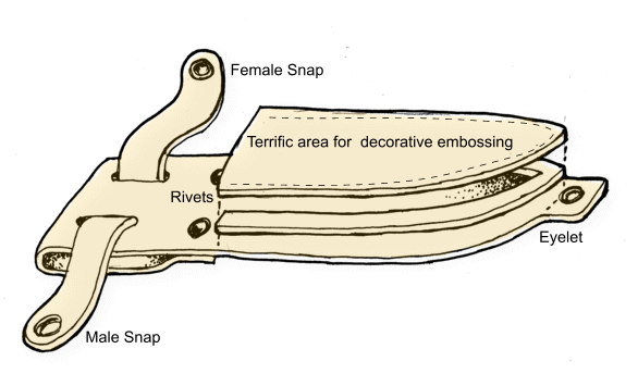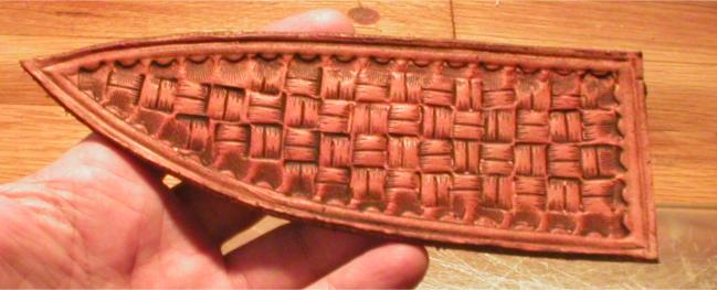 This is a picture of the layered sheath we made in the Leather Sheath Tutorial # 2. This particular tutorial is going to show you several ways to dress up the front panel of this sheath, but these techniques can be applied to a foldover construction sheath or even a kit sheath | |