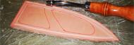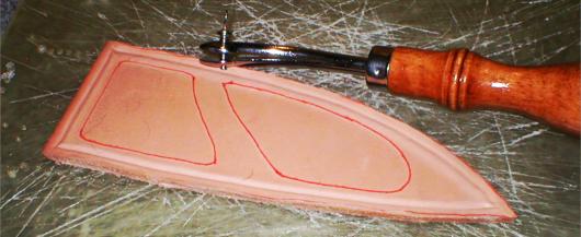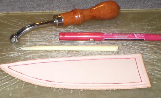 First step is to establish the stitching outline with a creasing tool along the edge. I use a sharpened chopstick to accentuate this. Do this while the leather is wet so it will dry and hold this shape. I then use a red roller ball pen to establish the inner outline that the pattern will be inside of. The red color will disappear under the dye color. | |