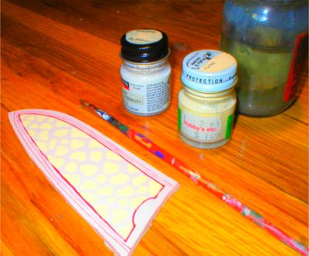 Any surface treatment that will affect how the leather dye soaks in and makes the surface look different will work. I'm using a matt tan acrylic hobby paint here, applied freehand inside the embellishment area outlined in red pen. | |
