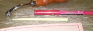For clean, rounded corners where I'm going to cut out the area for the inlays, I use a piece of sharpened 1/4" brass tubing. The tubing is sharpened from the inside with a conical grinding bit in a Moro-Tool. I then used an X-Acto blade to cut out the rest of the inlay area, | |
