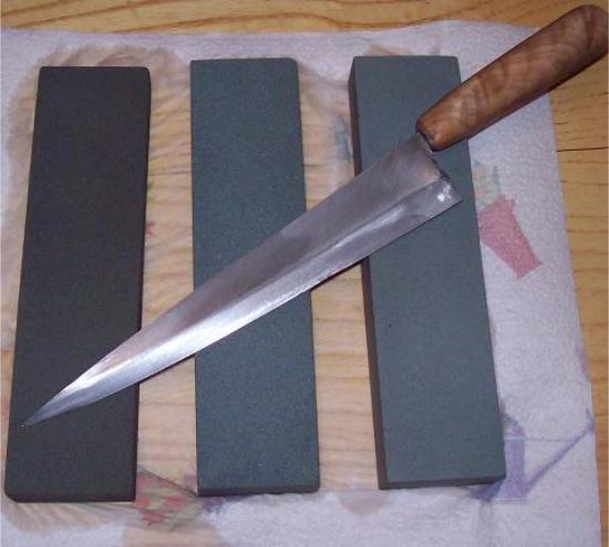 Sharpening stones are the most common means of putting an edge on your blade. Invest in a couple of good ones with fine and medium grits. The $5 combination stones from the hardware store are good for axes but I wouldn't recommend them for blades. Washita and Arkansas stones are the best and aren't as expensive as they used to be. | |