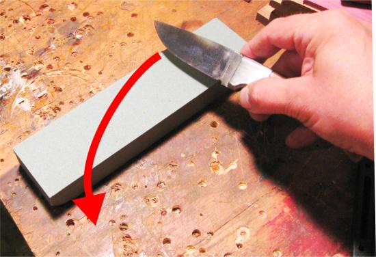 Use a continuous forward sweeping motion, keeping your angle constant and the edge always on the stone. I know some folks like oil on the stone but I don't and think you get better results without it. ( a lot less messy,too). | |