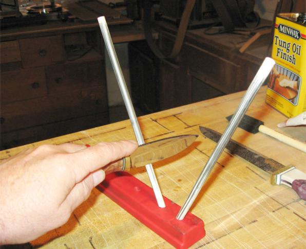 For day to day touch ups, I prefer using ceramic sticks angled at 20 degrees, 40 degrees relative to each other. Keep the knife perfectly vertical while swiping it down the rods like you were slicing a decal off. Make sure just the very edge is making contact and you'll have a like new cutting edge. Here's a good illustration, click HERE . I made my own by mounting a couple of ceramic rods in a block of wood, but here's a good video of how to use one of the factory made ones. Click HERE | |