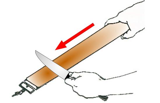 The leather strop is a great way to polish a razor sharp edge into a blade. I made mine out of a scrap piece of leather--an old belt would work fine. Rub jewelers rouge or rubbing compound , an extremely fine abrasive, into it. Drag the blade backwards with the edge trailing to polish the edge. Do this 15-20 times. This will give you a remarkable edge that you can shave with. I found this video on Youtube showing a good technique. Click HERE. You can use a free hanging strop but I like to mount the leather to a block of wood for ease of use. | |