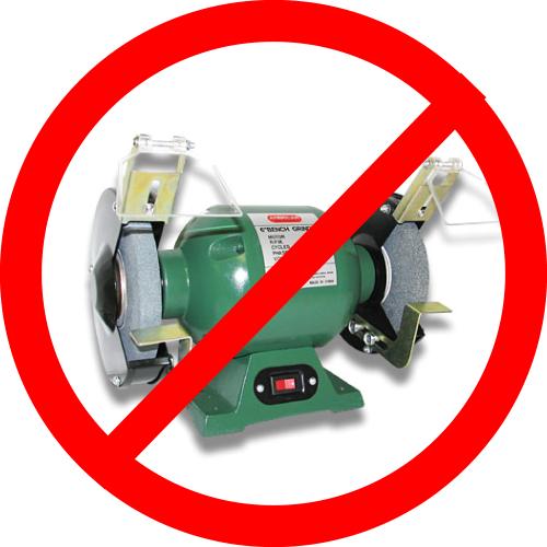 In the world of knife sharpening there is no place for the bench grinder. Not only does it remove a ton of metal, it's high speed will often cause the edge to overheat and lose it's temper (hardness). Save the electric grinder for your lawnmower blades, shovels or axes. | |