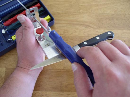 Touch ups with hand held little unit like this. Basically there are two ceramic or tungsten rods held at a good sharpening angle that you drag the knife edge through. They straighten the edge like a sharpening steel and take off a small amount of metal to give you a respectable and very useable ( if not razor sharp) edge. The main advantage is that it's such a small little piece, you can have one in the car, kitchen, workshop, etc... | |