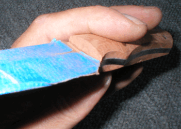 placement. Notice the taped blade and the jig made from scraps of wood to