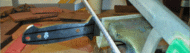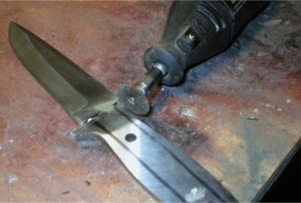 I use a hacksaw with a good blade to cut down to the marked line using the existing guards as a reference. Notice the cardboard wrapped around the knife in the vise to prevent marring the blade. | |