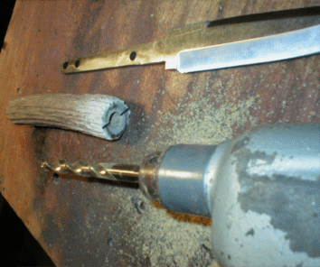 I had a short piece of shed horn that I wanted to use for the handle. After cutting it to length, I use a long 3/8" drill bit to start the tang hole, making sure I check the depth ( I don't want to drill all the way through!) . Wiggle the drill a little to widen the hole to the correct width for the tang. | |