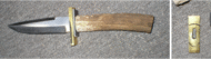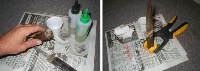 This step, epoxying the handle, is very similar to the technique used for the Puukko construction. Use a good, slow set epoxy, set the tang into the handle, plug the weep hole with a toothpick, and set it aside to cure in a vertical position | |