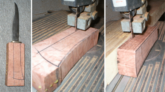 Trace the outline of the handle on the block and split it down the centerline with a bandsaw. Mark the outline of the tang on the inside to act as a guide to show you what's going to be needed to be routed or carved out to fit the tang. | |
