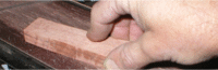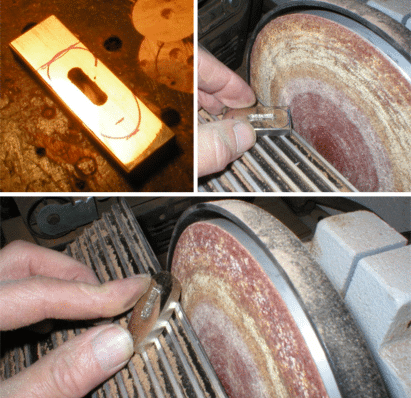 Bring to a final shape by starting on the belt sander and finish by hand sanding. ( Isn't this easier to do now than after the handle is mounted on the blade?). Finish up with several fine grits of sandpaper. | |