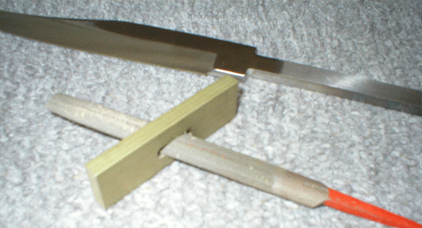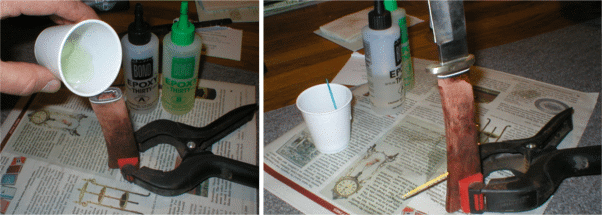 Now the messy part. Mix a good three hour epoxy and pour it into the tang hole. A 1/16" weep hole near the bottom ( see the toothpick?) allows air to escape while the epoxy works it's way down the inside. Slide the tang in and check for alignment. Hold it upright with a clamp while it cures. Use those three hours to clean the excess epoxy off your hands. | |