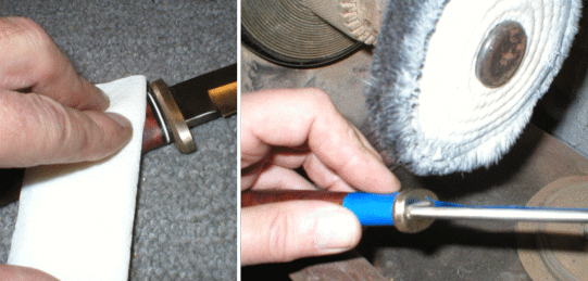 Before the epoxy has fully set, clean up any of the excess with a rag and some acetone. After the epoxy has set, tape off the handle and buff the guard for a few minutes. I used several coats of tung oil for a finish on the handle but any penetrating oil finish will do. | |
