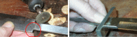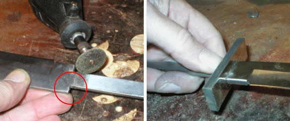 For a perfect fit, I use a fiberglass disk in a Dremel tool to square off the inside shoulders where the tang meets the knife. Keep checking the fit of the guard. Ahhhh, that's what it's supposed to look like. Good ,tight fit. | |