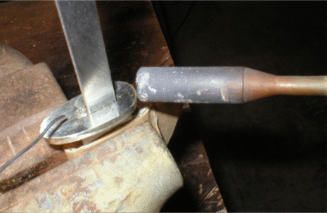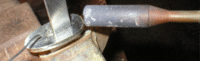 Slide the guard on and solder. Soldering is kind of optional since the guard will be trapped between the shoulders of the knife and the epoxied handle, but I think this adds a lot of strength and a professional appearance. For a more in depth tutorial on soldering techniques, see Hints n Tips, Page 3. | |