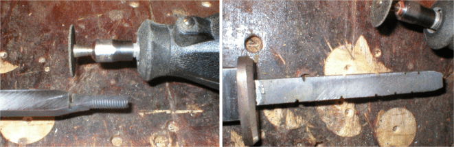 I use the fiberglass disk in a Dremel again to shorten the tang to fit the handle I want. As long as I've got this out, I "nick" the tang in a few random places to give the epoxy something more to hang onto. | |
